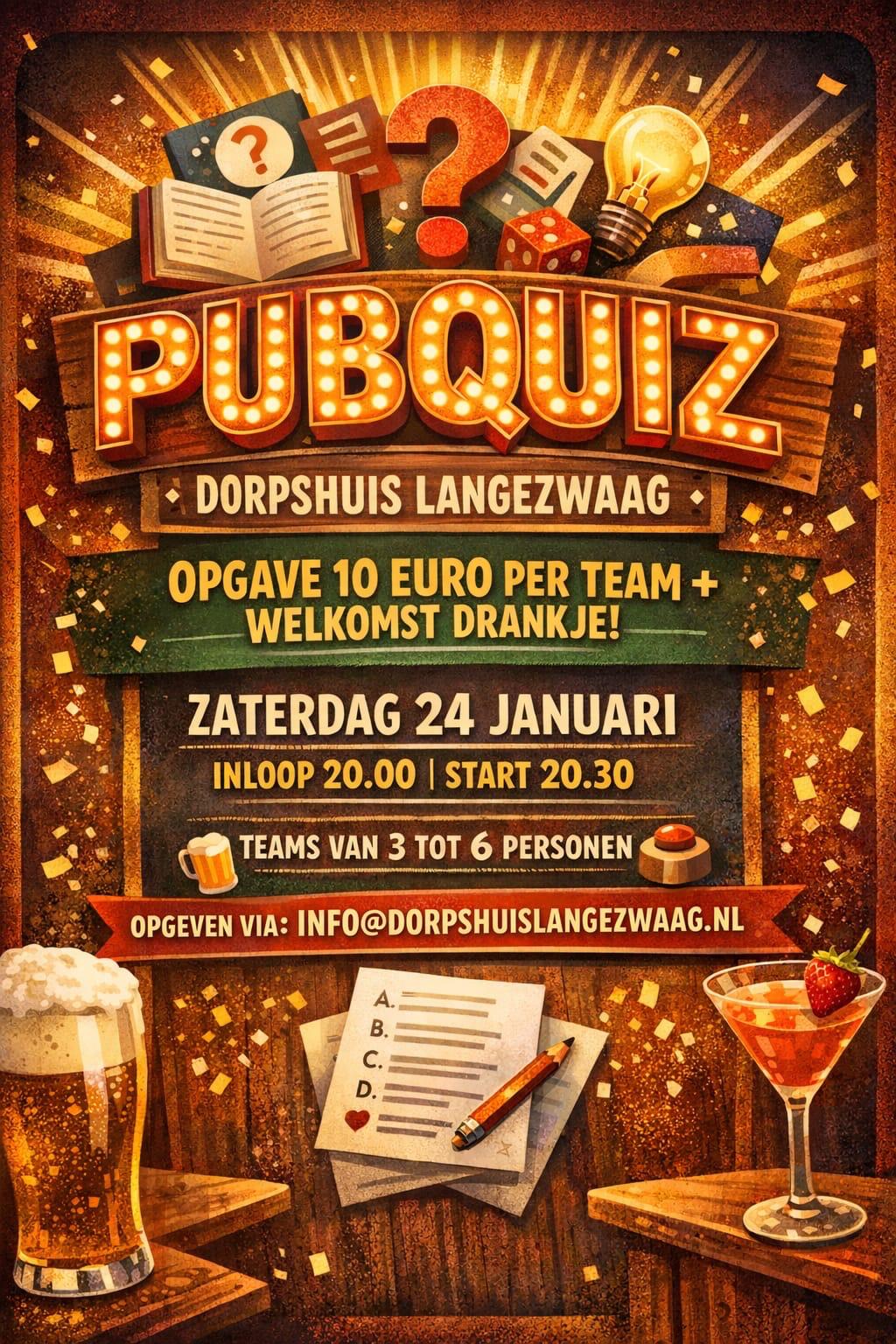 De pubquiz zal op zaterdag 24 januari 2026 plaatsvinden.